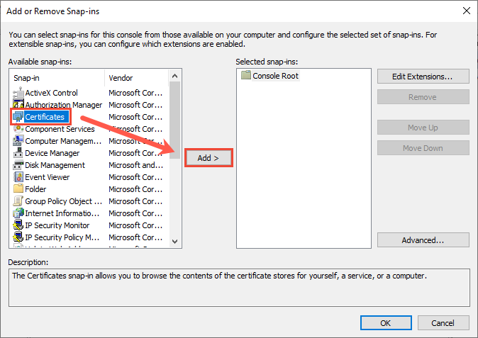 In the list of available snap-ins click Certificates and then click Add. As many Consoles as are required can be created containing the tools needed for a range of tasks. The Microsoft Management Console MMC provides a location for you to use administrative tools called snap-ins.